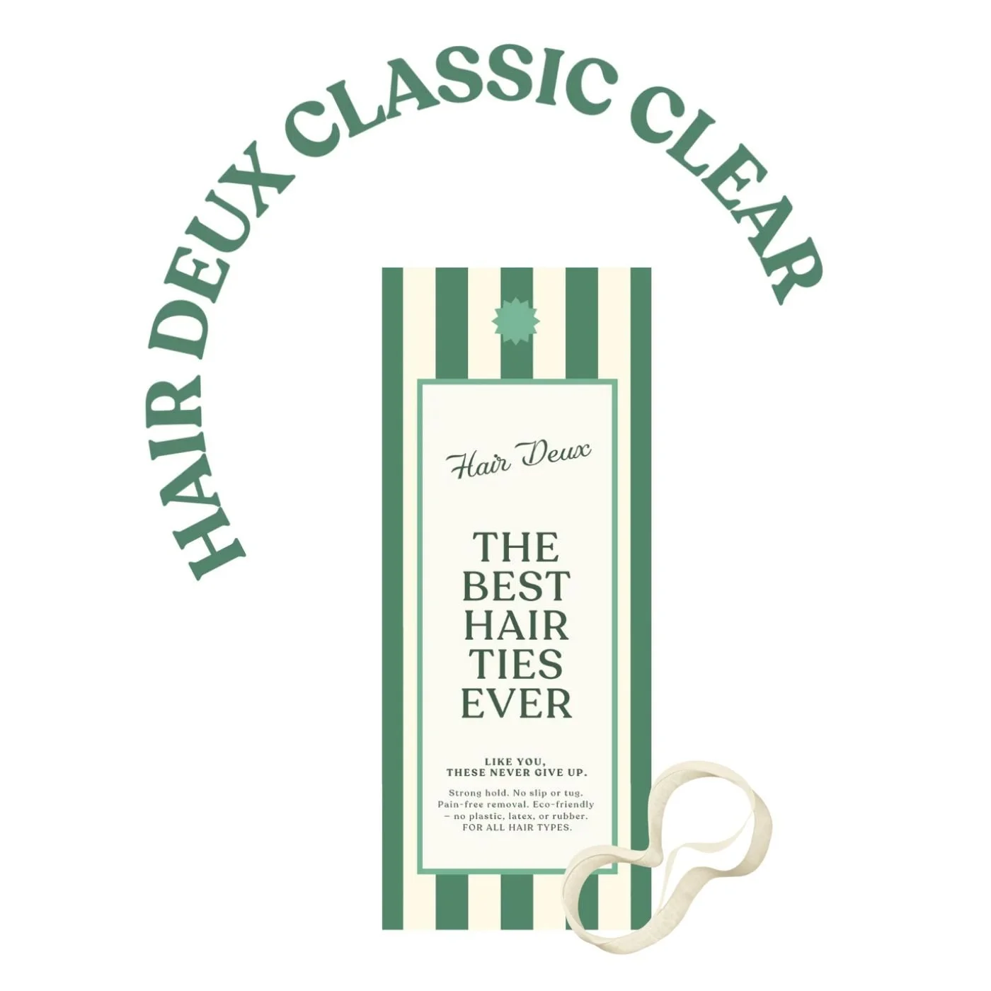 Picture this: You're fixing your hair to the perfect updo, arms are aching, trying to rush out the door, and then snap! Your hair-tie breaks. You have to manipulate your hair all over again to get that look you were striving for. Or remember the time you were out and about on a hot day trying to stay cool, never needing a hair-tie more in that moment - and then your only hair-tie you carry with you breaks! Hair Deux set out to fix the issues of the snapping hair-ties. You will not have to worry about these inconveniences with “Hair Deux Classic Clear” ties in your hair kit.